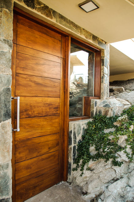 La obra es un conjunto geométrico que contrasta con la naturaleza y que, acompañando los saltos de la piedra, se abre a las diferentes vistas del entorno, el lago y la montaña. El conjunto esta compuesto por la vivienda principal, una cabaña o casa de huésped, la piscina con hidromasaje y la sala de juegos con asador.